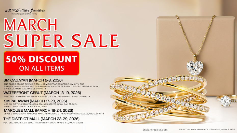 1. Promo starts from March 2-29, 2026. 2. Customer may avail items at up to 50% discount. 3. This promo is available only in Selected ML Jewellers Showrooms.