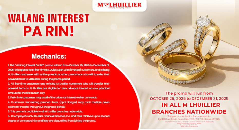 1. The “Walang Interest” promo will run from October 25, 2025 to December 31, 2025, this applies to all first-time ML Quick Cash Loan (Prenda) customers, and existing M Lhuillier customers with active prenda at other pawnshops who will transfer their pawned items to M Lhuillier during the promo period.
